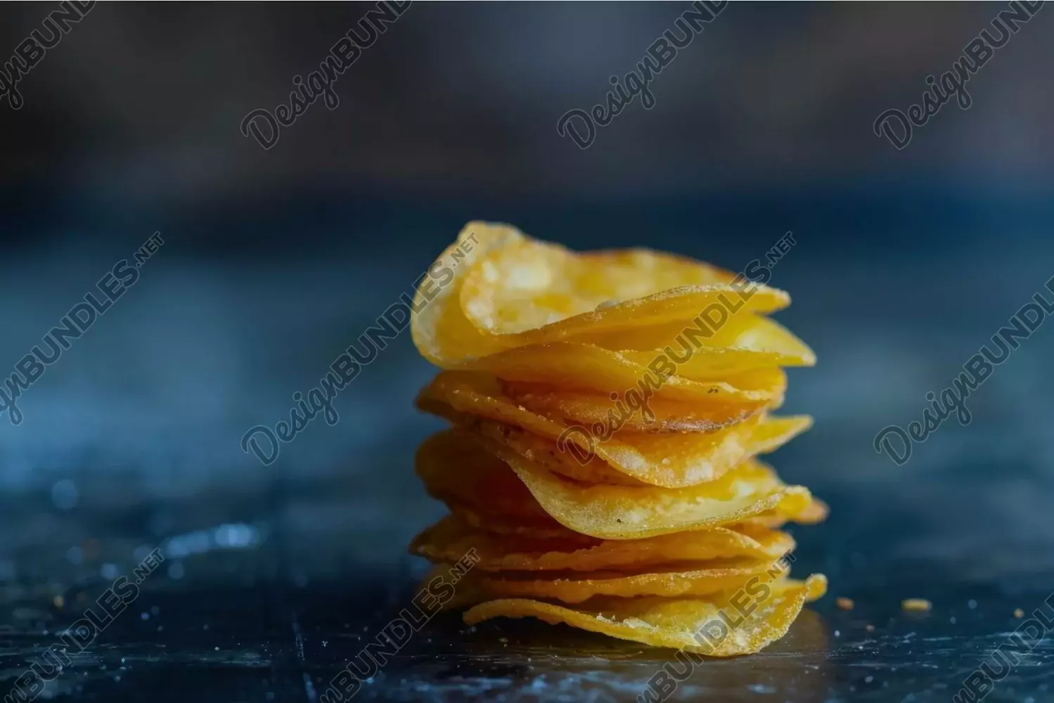 Similar Design Products to Stack of crispy potato chips standing on dark blue surface