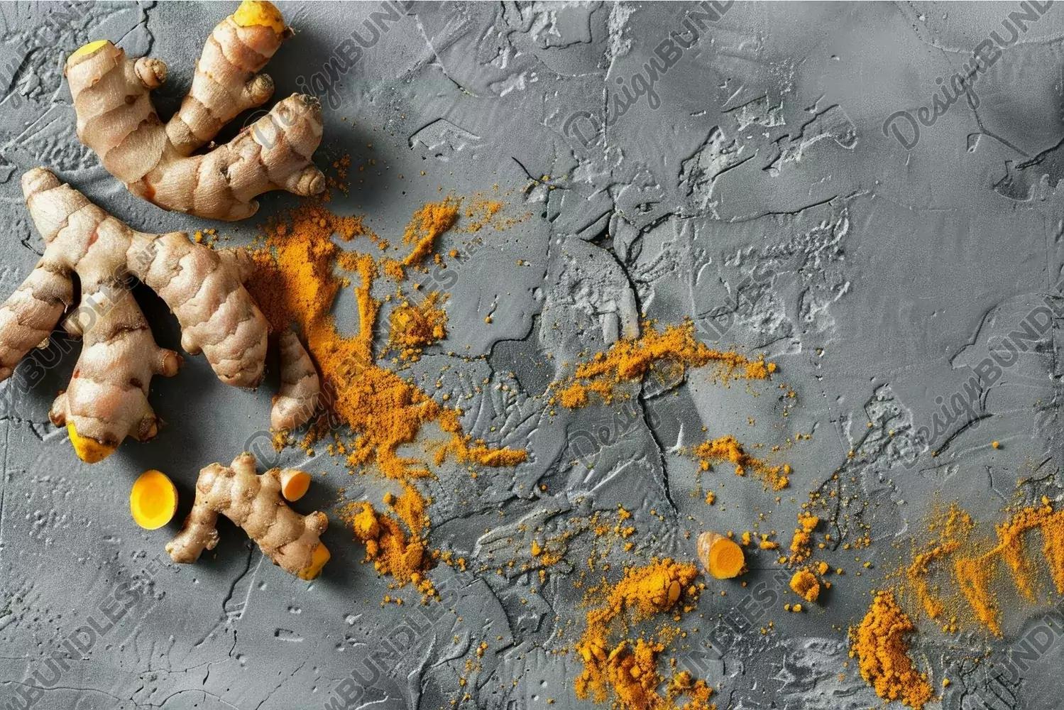 Top view of raw turmeric roots and powder scattered on a dark, textured surface