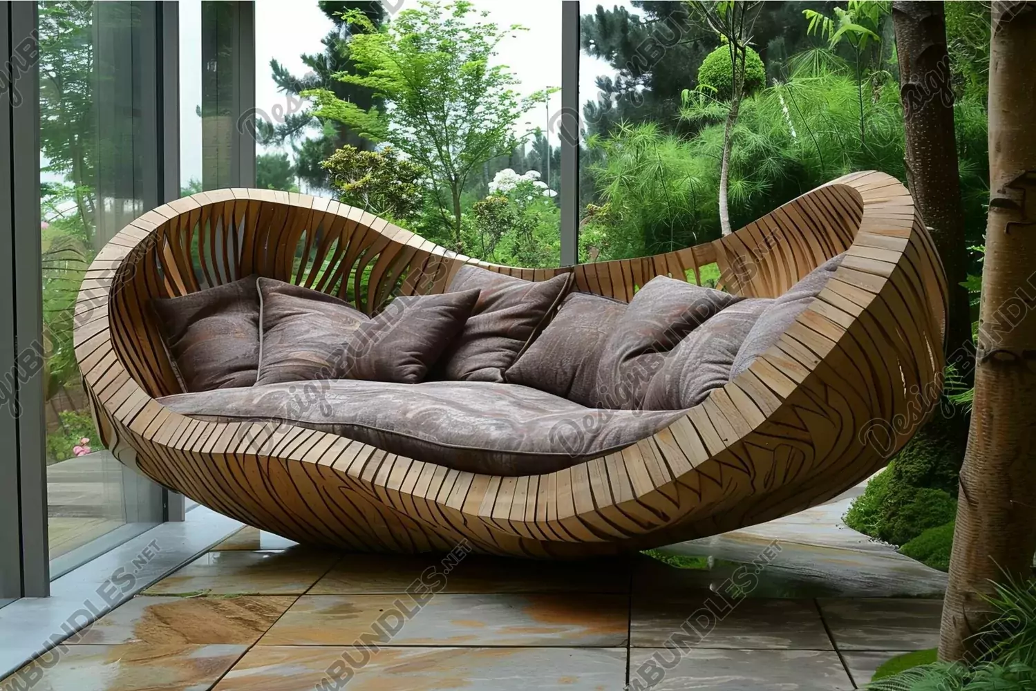 Modern wooden sofa standing on a terrace overlooking a garde example image 1