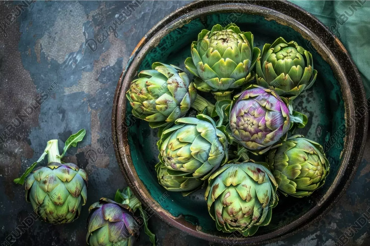 Rustic Green Raw Vegetables Healthy Top View Bowl Ceramic Artichokes