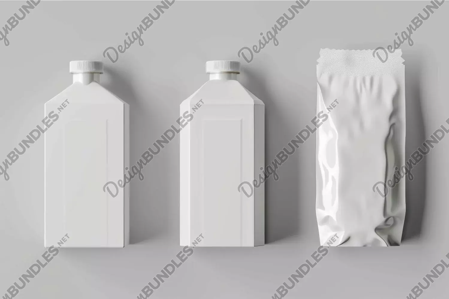 Two white bottles and one blank foil bag standing up on gray example image 1