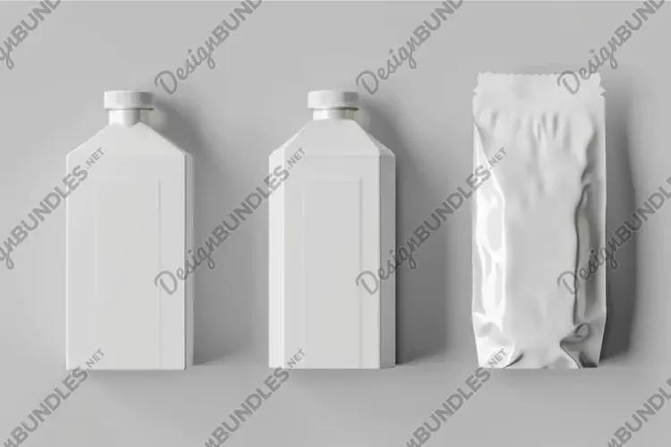 Similar Design Products to Two white bottles and one blank foil bag standing up on gray