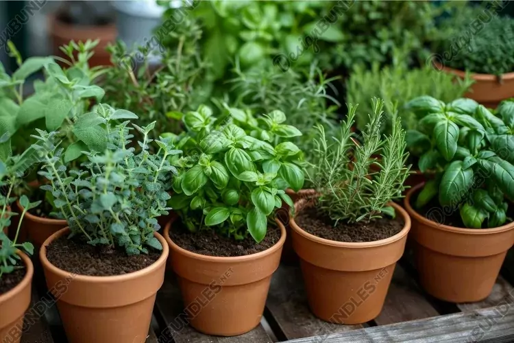 Lush Aromatic potted herbs. Generate Ai example image 1