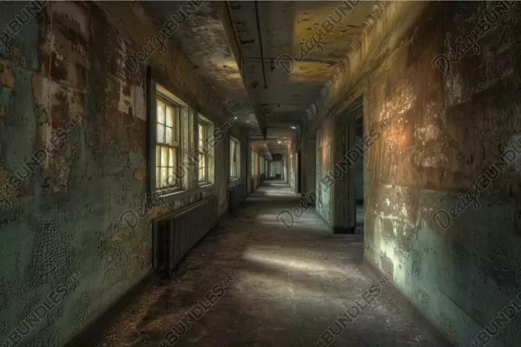 Eerie abandoned asylum corridor with peeling paint and sunset light casting shadows