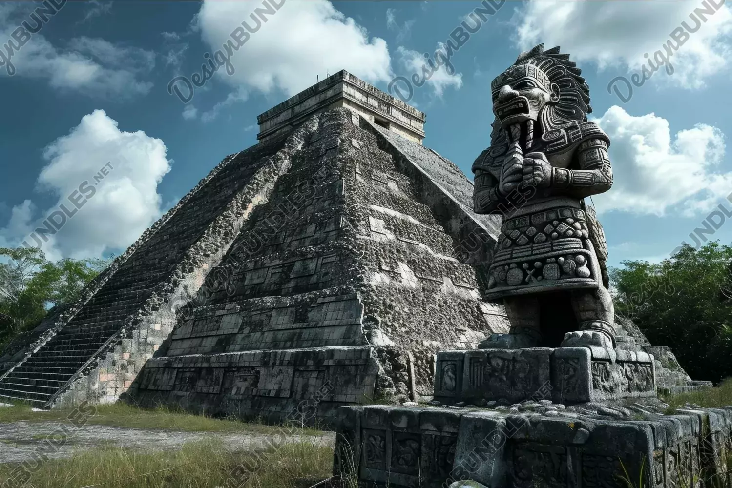 Majestic mayan pyramid with a detailed stone warrior sculpture in the foreground