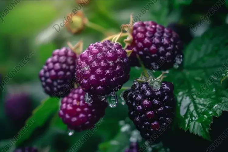 Close-up of ripe blackberries with fresh dew drops in a lush garden