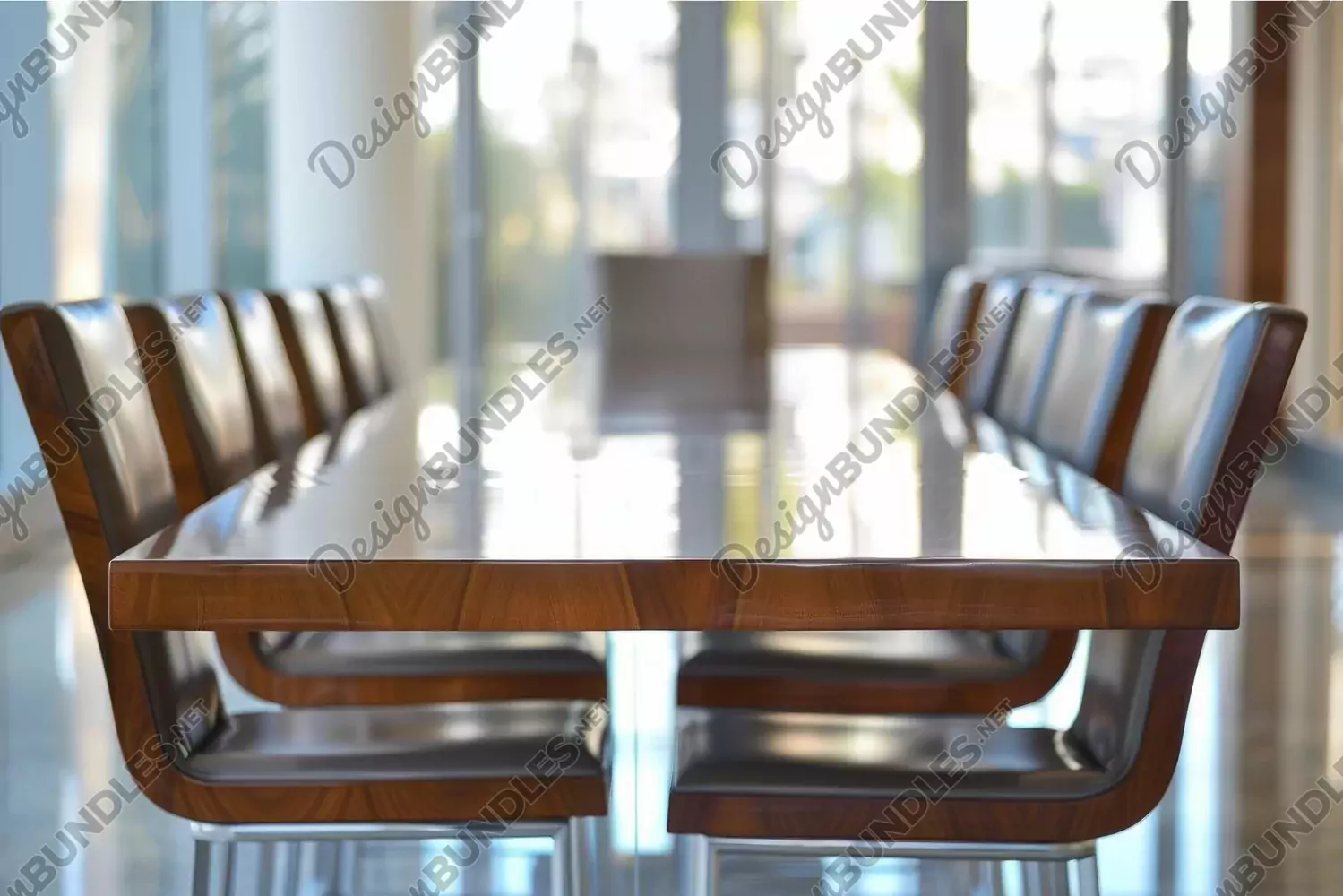Bright meeting room interior focuses on a polished wooden conference table and leather chairs
