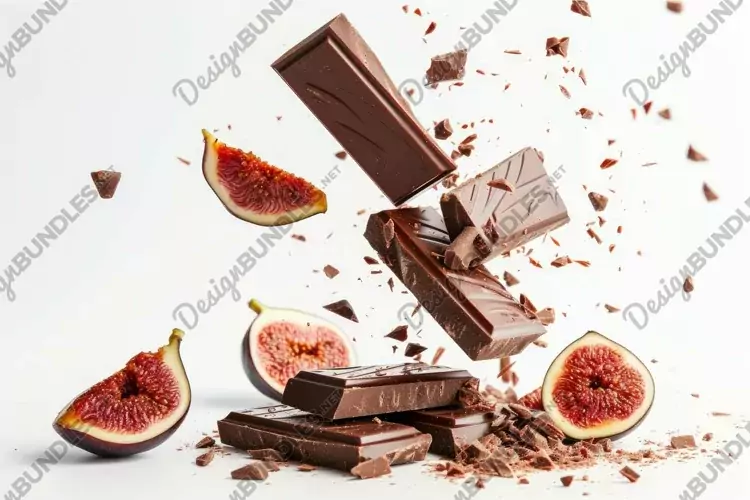 Dynamic image of a chocolate bar bursting into pieces with ripe figs on a light background