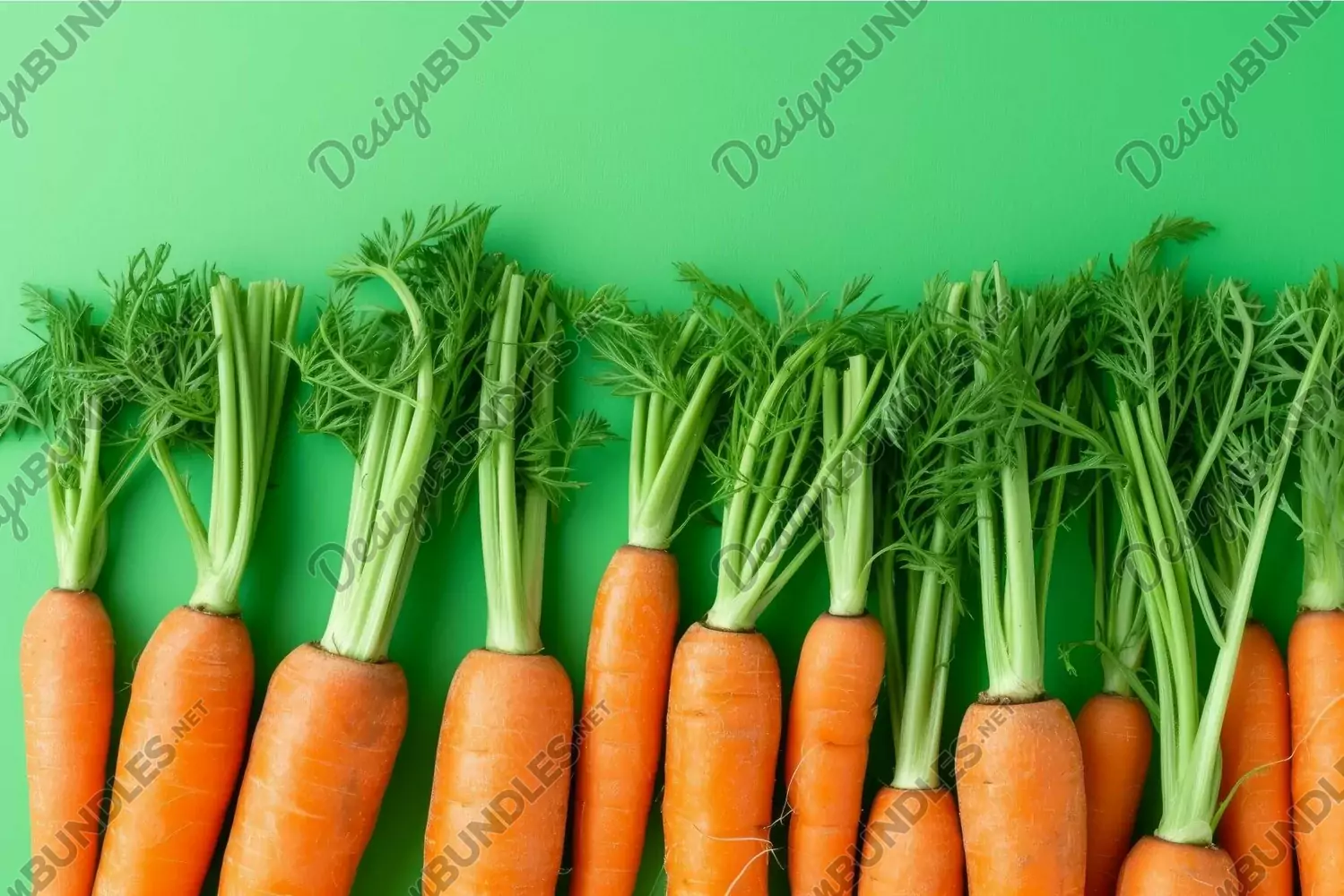Top view of vibrant orange carrots with greens arranged neatly on a bright green surface