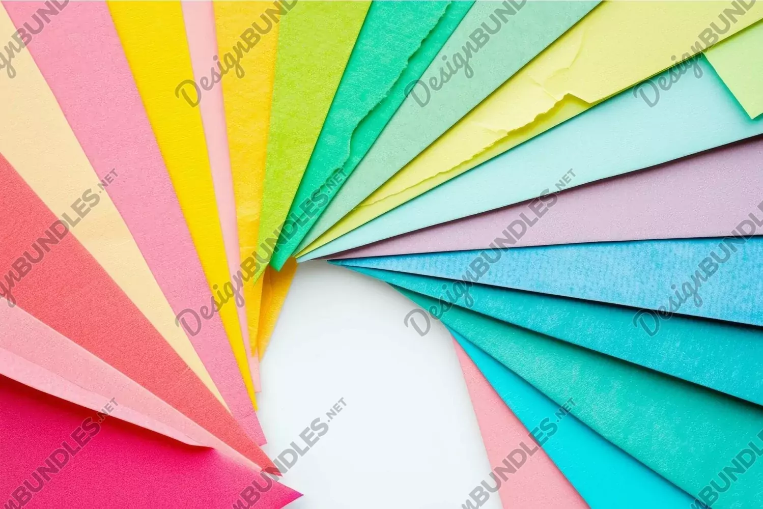 Bright and artistic display of multicolored paper sheets arranged in a fan shape