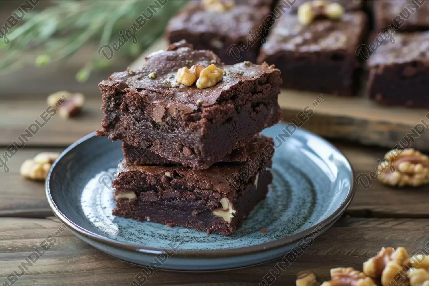 Stack of homemade brownies with walnuts, served on a ceramic plate