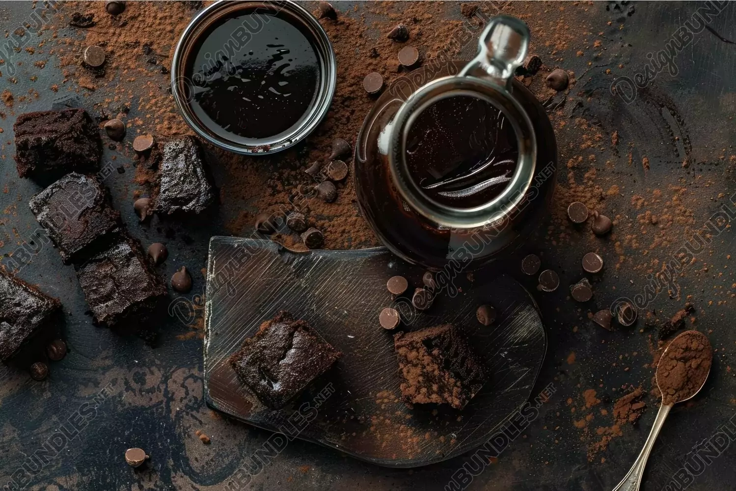 Decadent chocolate brownies and sauce on rustic table example image 1