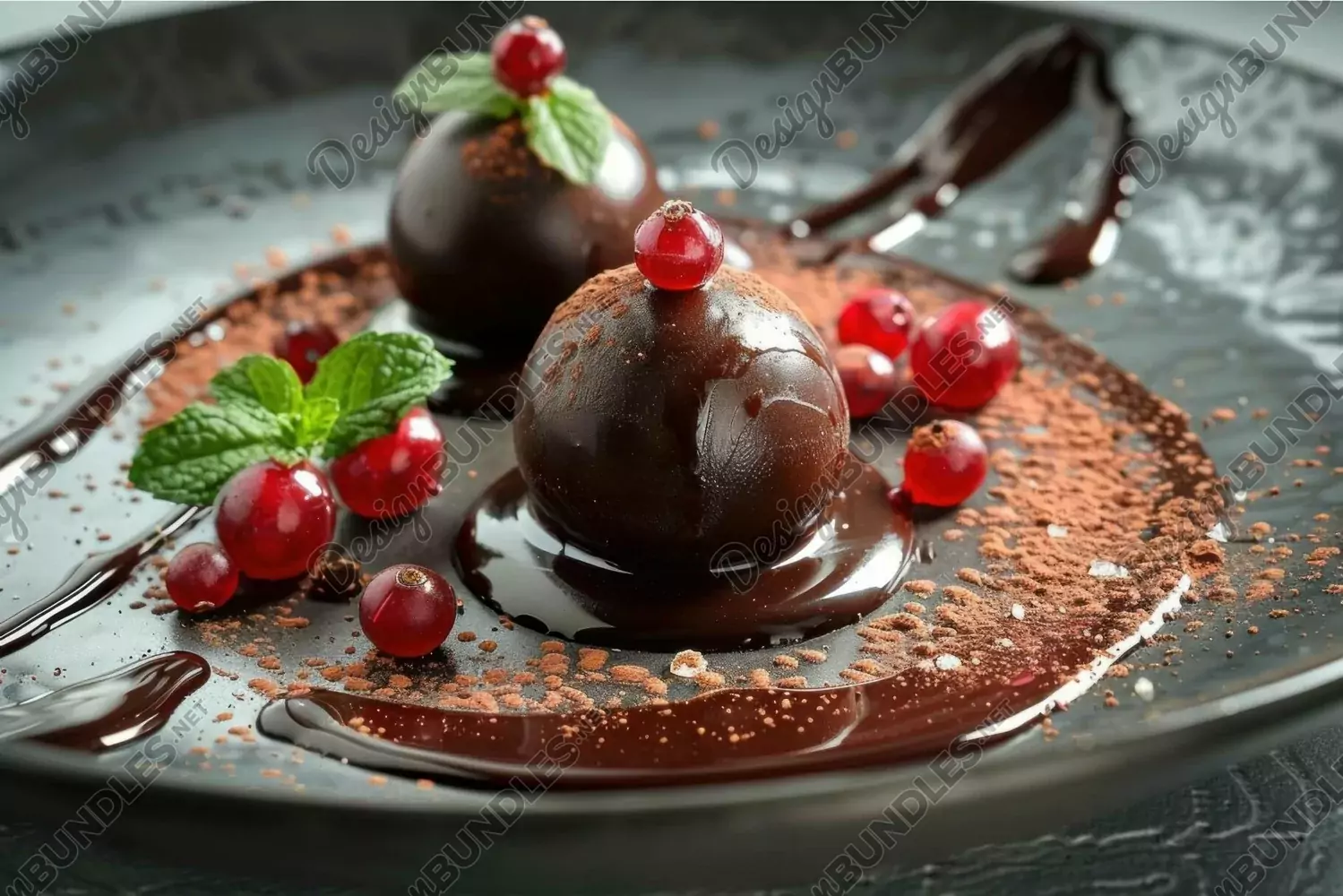 Exquisite chocolate spheres topped with redcurrants served on a dark plate with artistic chocolate sauce