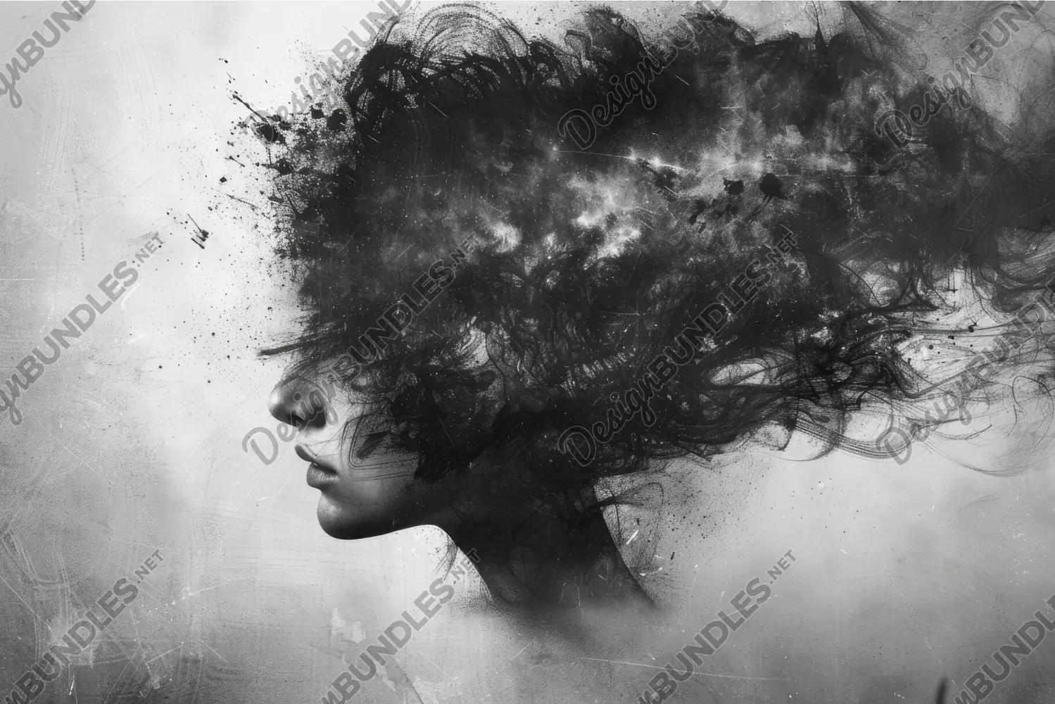 Monochromatic image of a woman with a captivating dispersion effect that melds her hair with a cosmic background