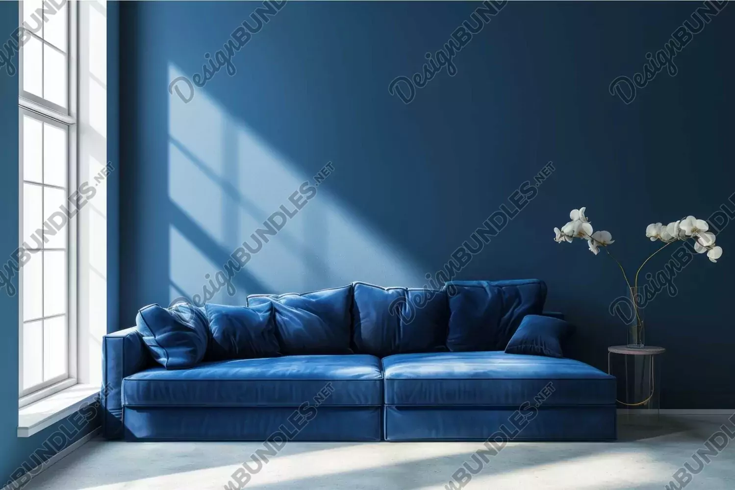 Stylish interior with blue velvet sofa, dark walls, and natural light streaming through window