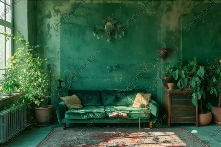 Vintage Rustic Green Interior Home Furniture Living Room Cozy Houseplants