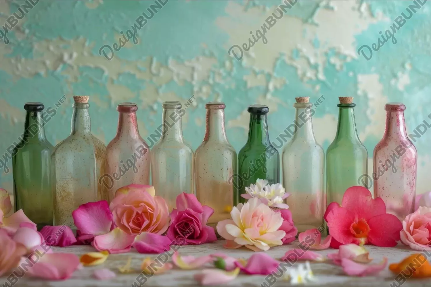 Vintage Rustic Textured Colorful Flowers Fresh Wall Backdrop Glass Bottles