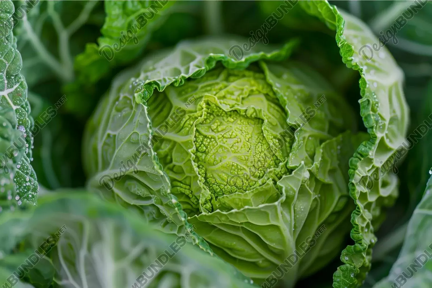Macro shot of a green cabbage with morning dew on its leaves example image 1