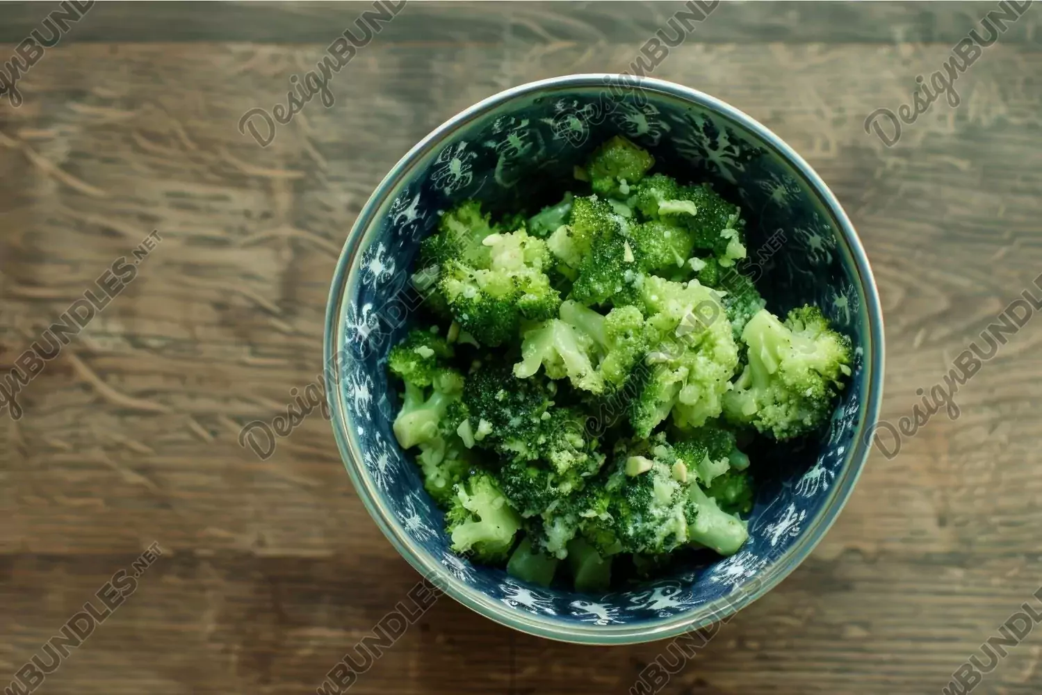Fresh steamed broccoli served in an ornate blue bowl on a wooden table