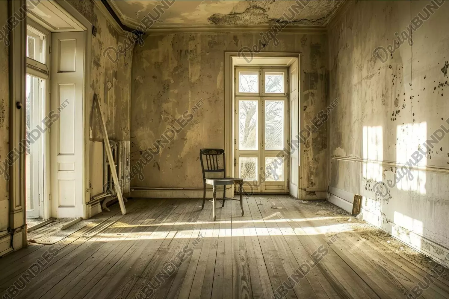 Sunlit dilapidated interior of an abandoned house with a lone chair by the window