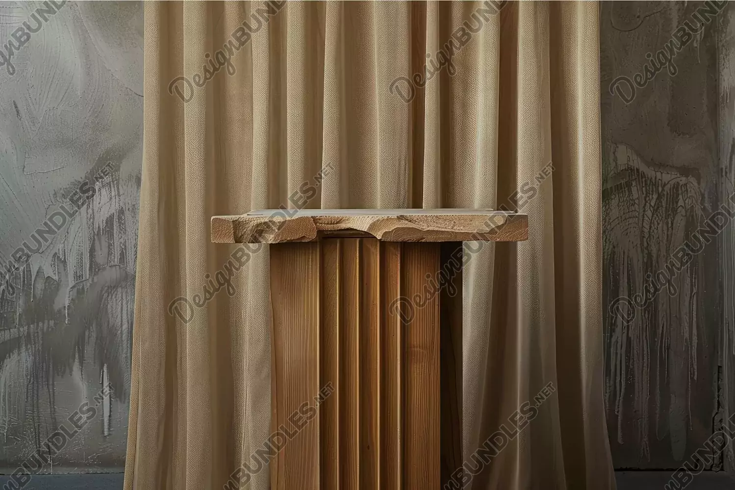 Elegant wooden table showcases simplicity and modern design against a textured curtain backdrop
