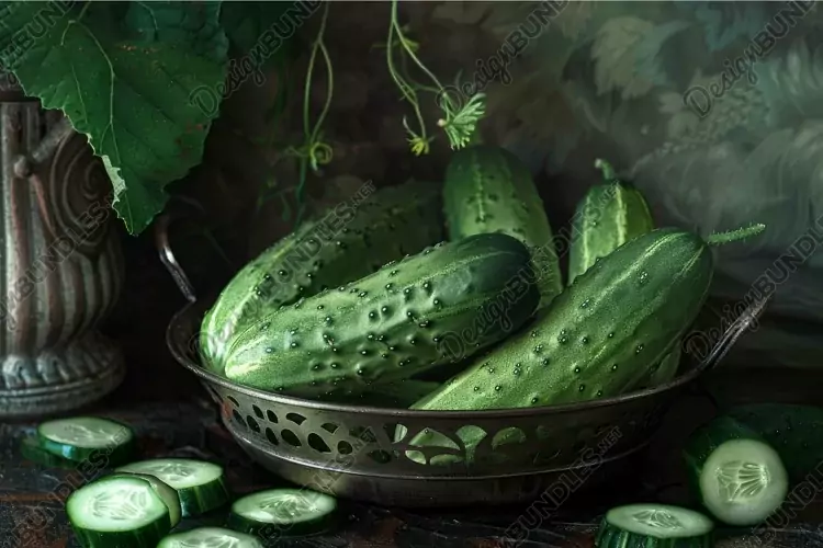 Vibrant green cucumbers and slices in an ornate metal bowl, with rustic kitchen backdrop