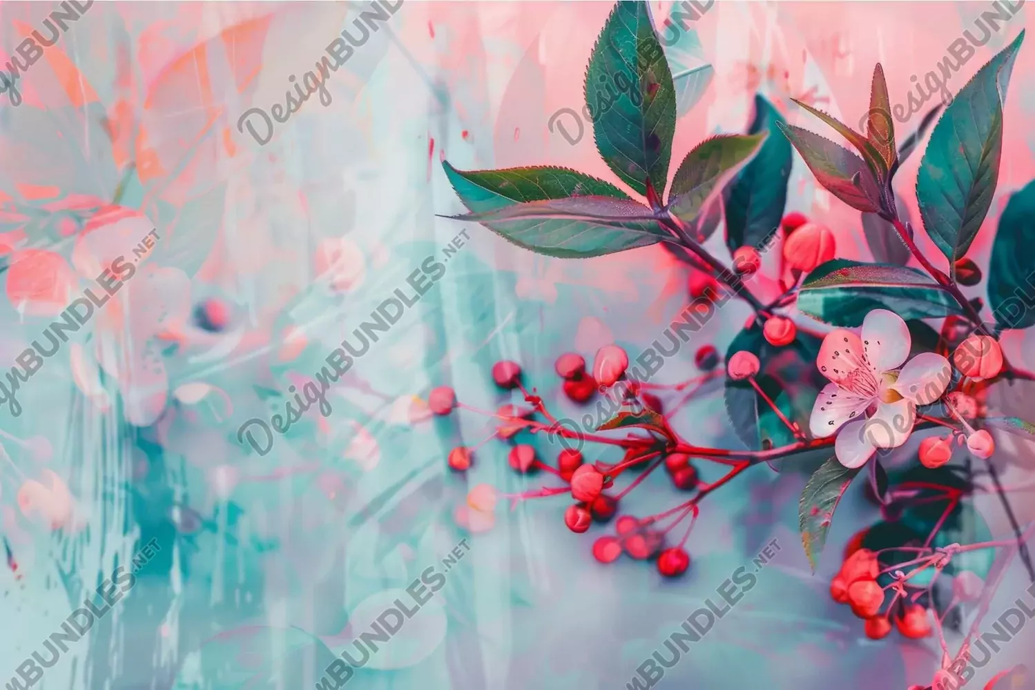 Digital artwork of delicate spring flowers with berries on a dreamy backdrop