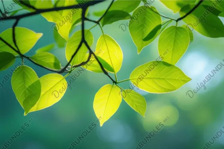 Sunlit green leaves on branch against bokeh background example image 1