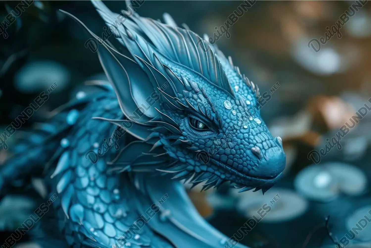 Close-up of a detailed illustration of a blue dragon with intricate scales and horns