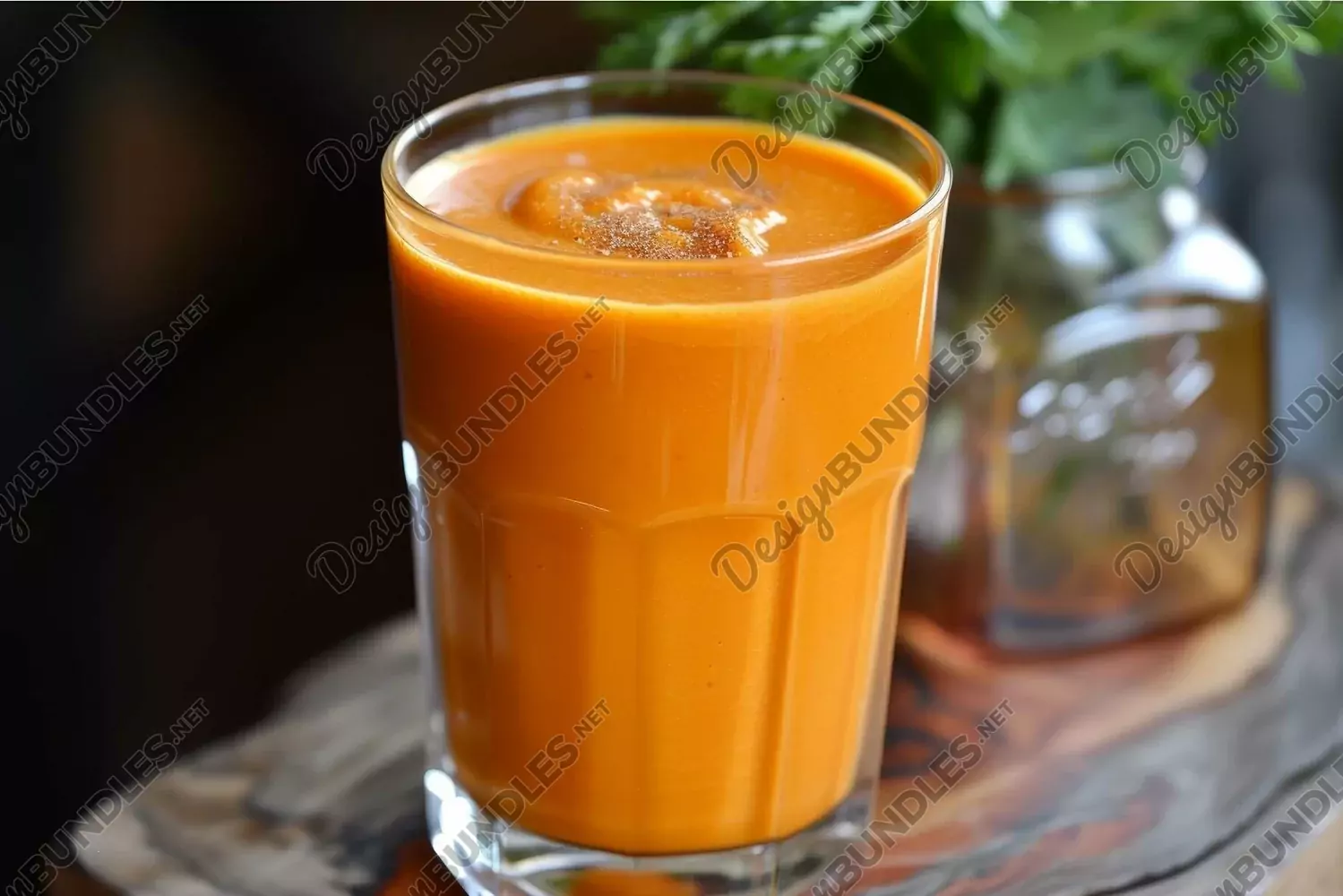 Vibrant glass of carrot juice, garnished with a sprinkle of spices, on a wooden table
