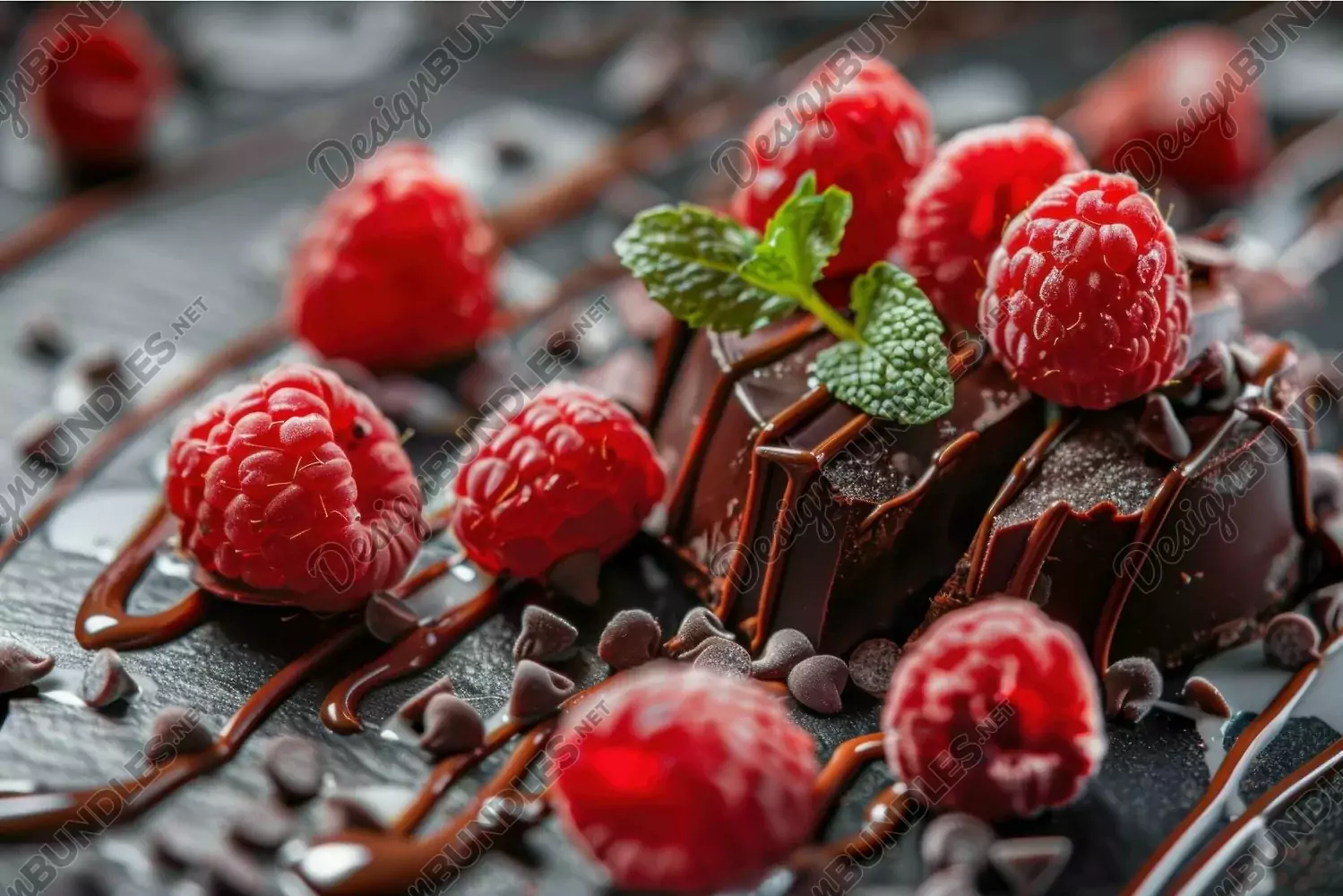 Exquisite dessert plate with dark chocolate pieces and ripe raspberries, elegantly garnished