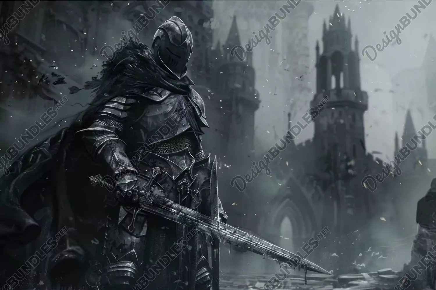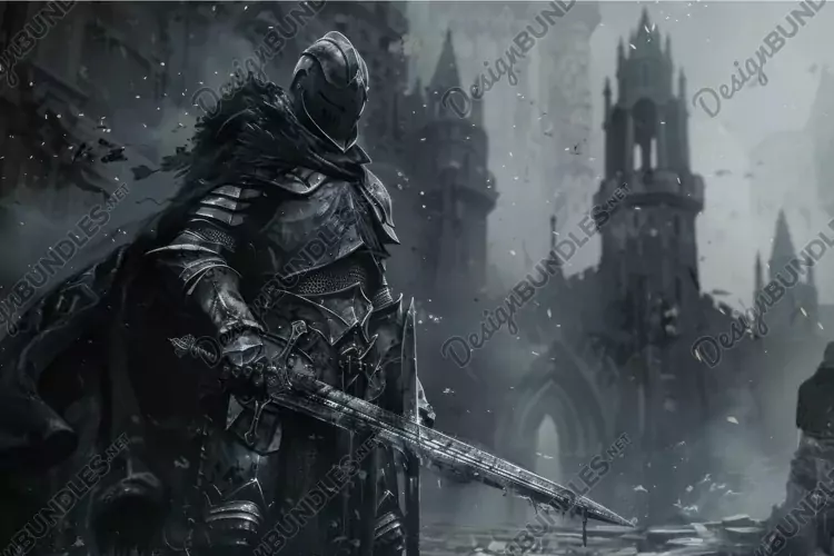 Darkly clad knight grips a sword, poised stoically among the ruins of a gothic cityscape