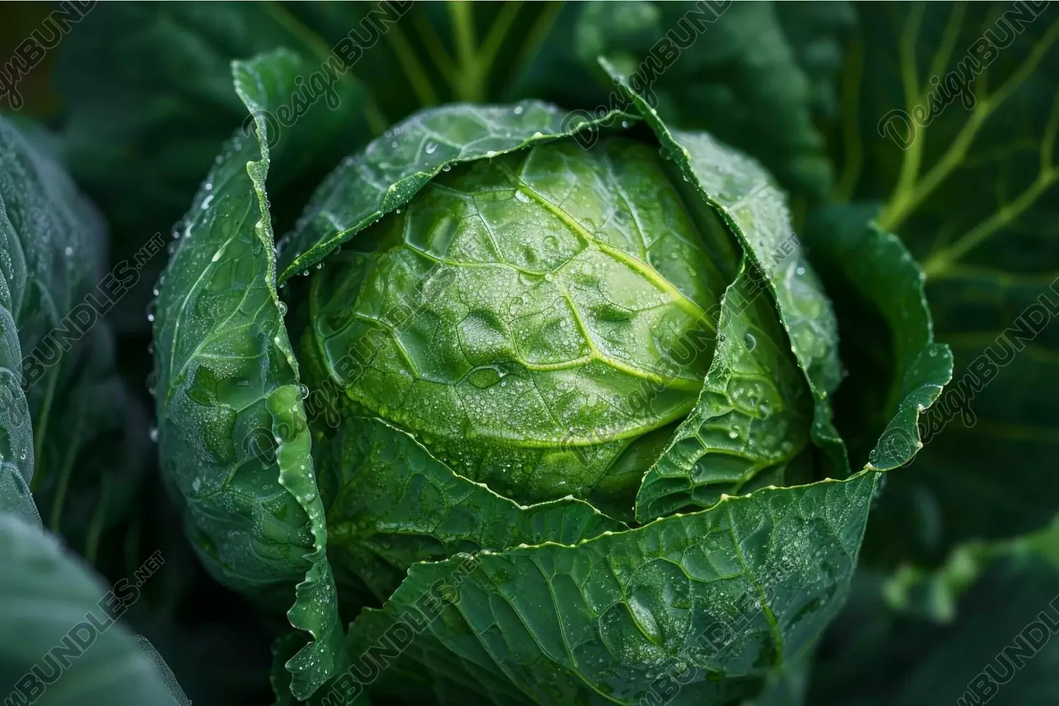 Close-up of a fresh green cabbage with dew drops on leaves, highlighting natural textures and vibrant colors