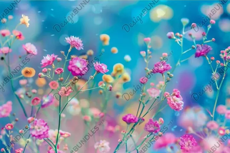 Vibrant and enchanting springtime bloom with colorful flowers and bokeh background in a natural garden setting, showcasing the delicate petals and bright, pastel colors of wildflowers
