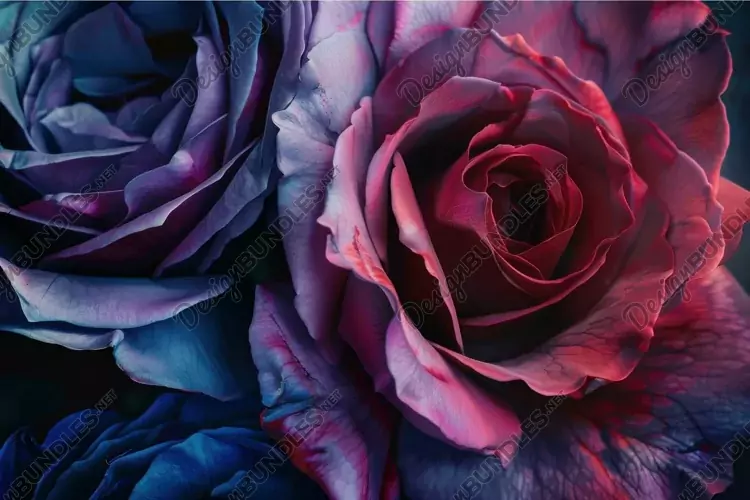 Closeup of enchanting twilight roses with dramatic and vibrant floral petals in blue, pink, and purple hues, showcasing the natural beauty and romantic elegance of these lush blooms