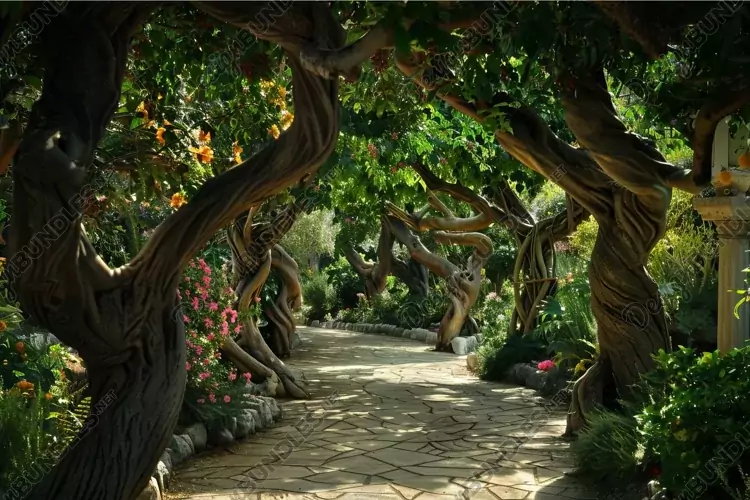 Mystical pathway bordered by twisted trees in a lush, bloomi