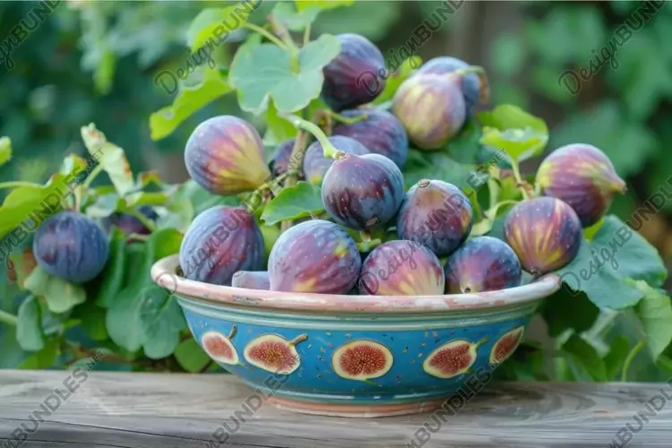 Ripe figs in a colorful ceramic bowl on a wooden surface with green leaves in the background