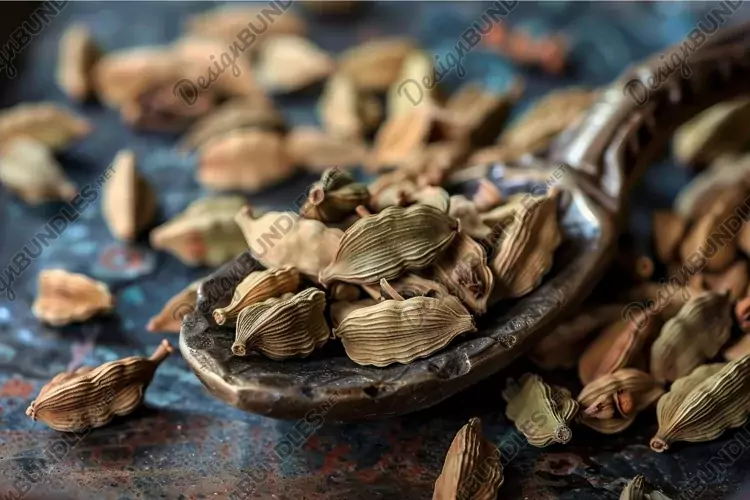 Vintage Rustic Textured Spice Up Spoon Surface Close Cardamom Pods