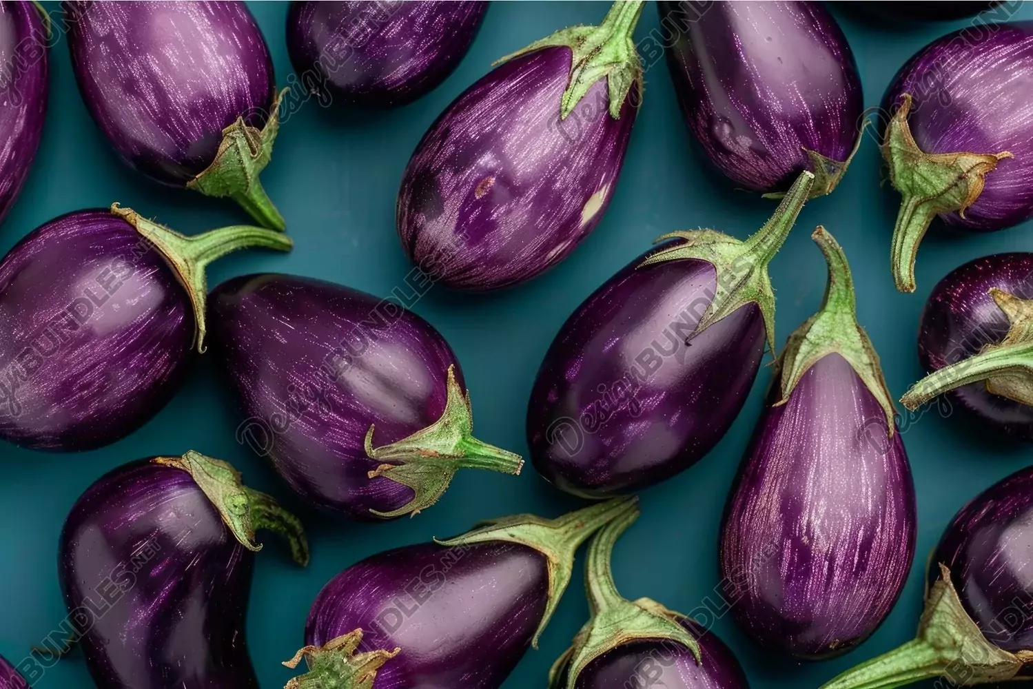 Top view of vibrant purple eggplants arranged neatly on a blue backdrop