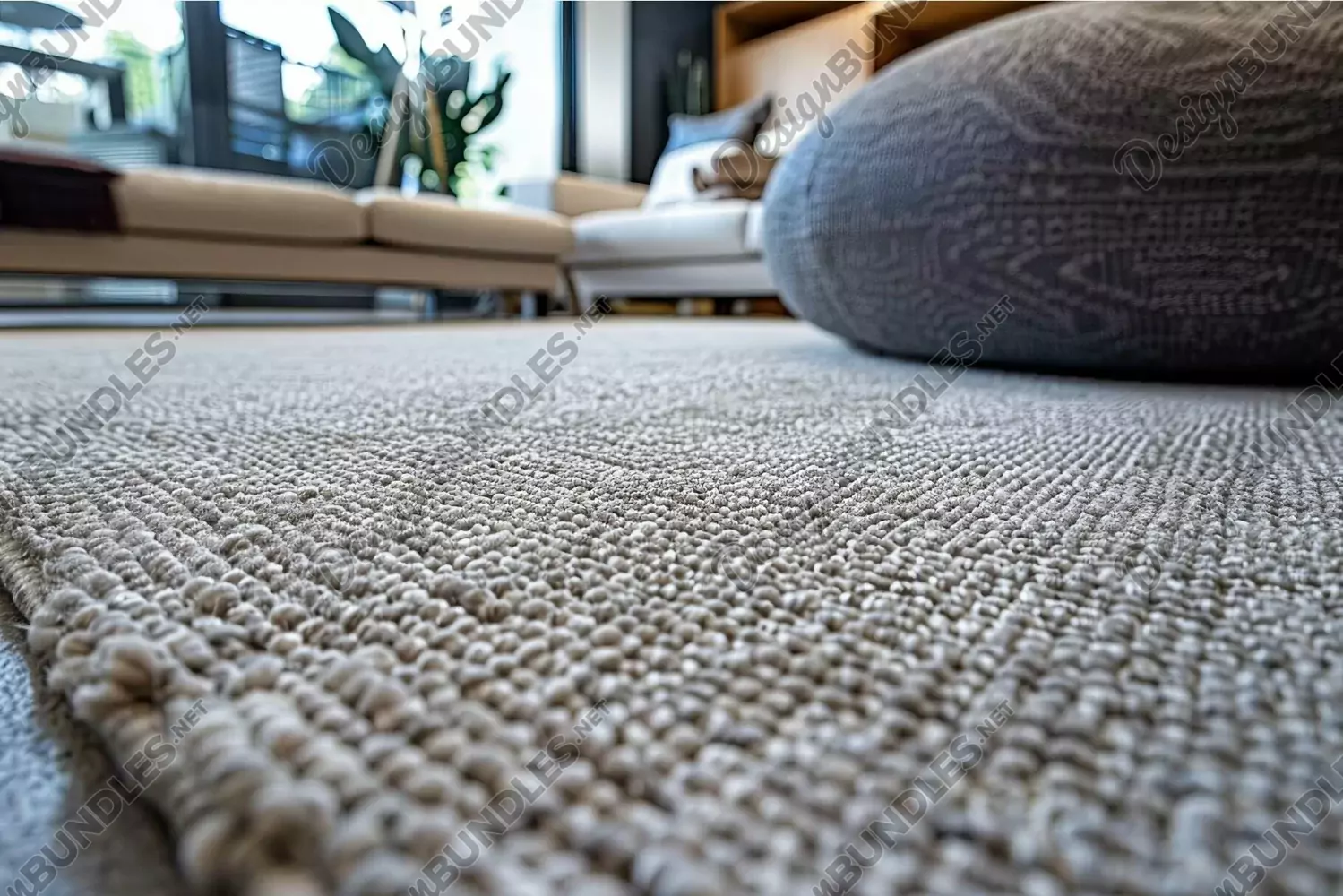Closeup of a textured rug in a modern living room with stylish furniture and plants