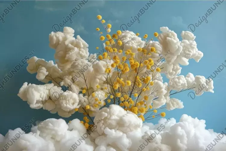 Creative setup featuring mimosa flowers blossoming out from fluffy white clouds against a blue sky