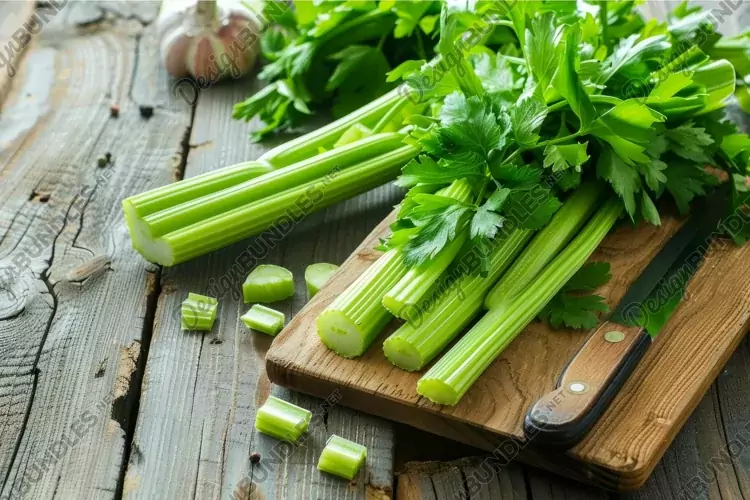 Similar Design Products to Fresh celery stalks laying on rustic cutting board