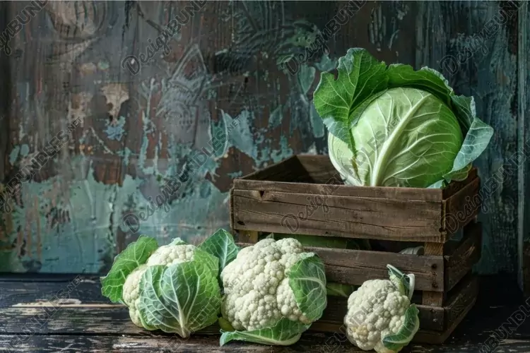 Similar Design Products to Fresh green cabbage and caulifower heads in old wooden crate