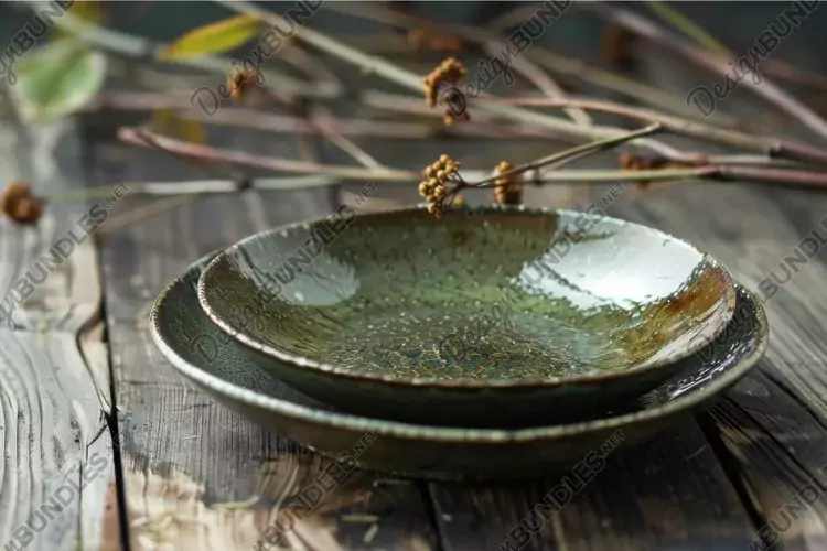 Similar Design Products to Two empty green ceramic plates standing on rustic wooden tab
