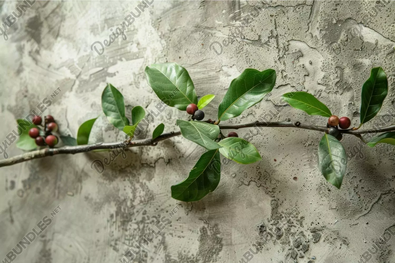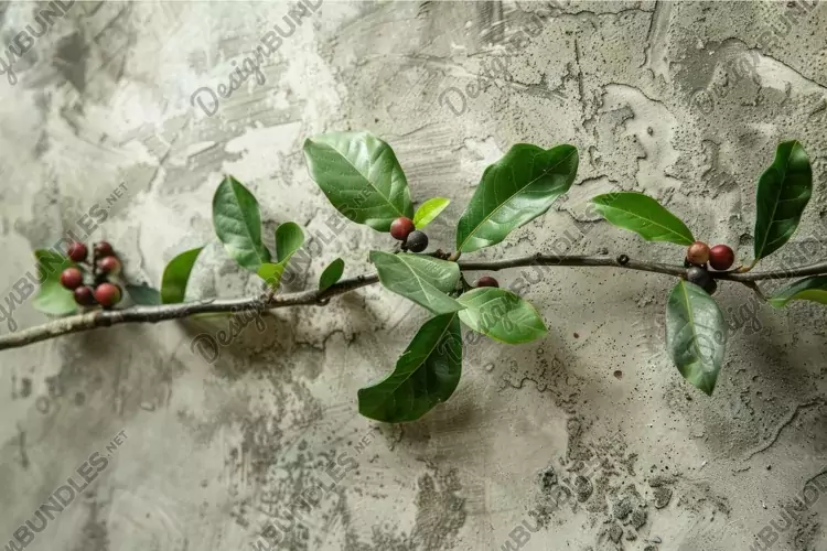 Branch with green leaves and berries growing on grunge wall example image 1