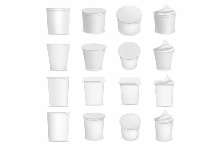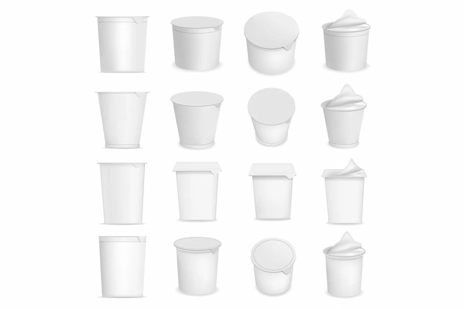 Yogurt cup box dessert packaging mockup set. Realistic illustration of 16 yogurt cup box dessert packaging mockups for web