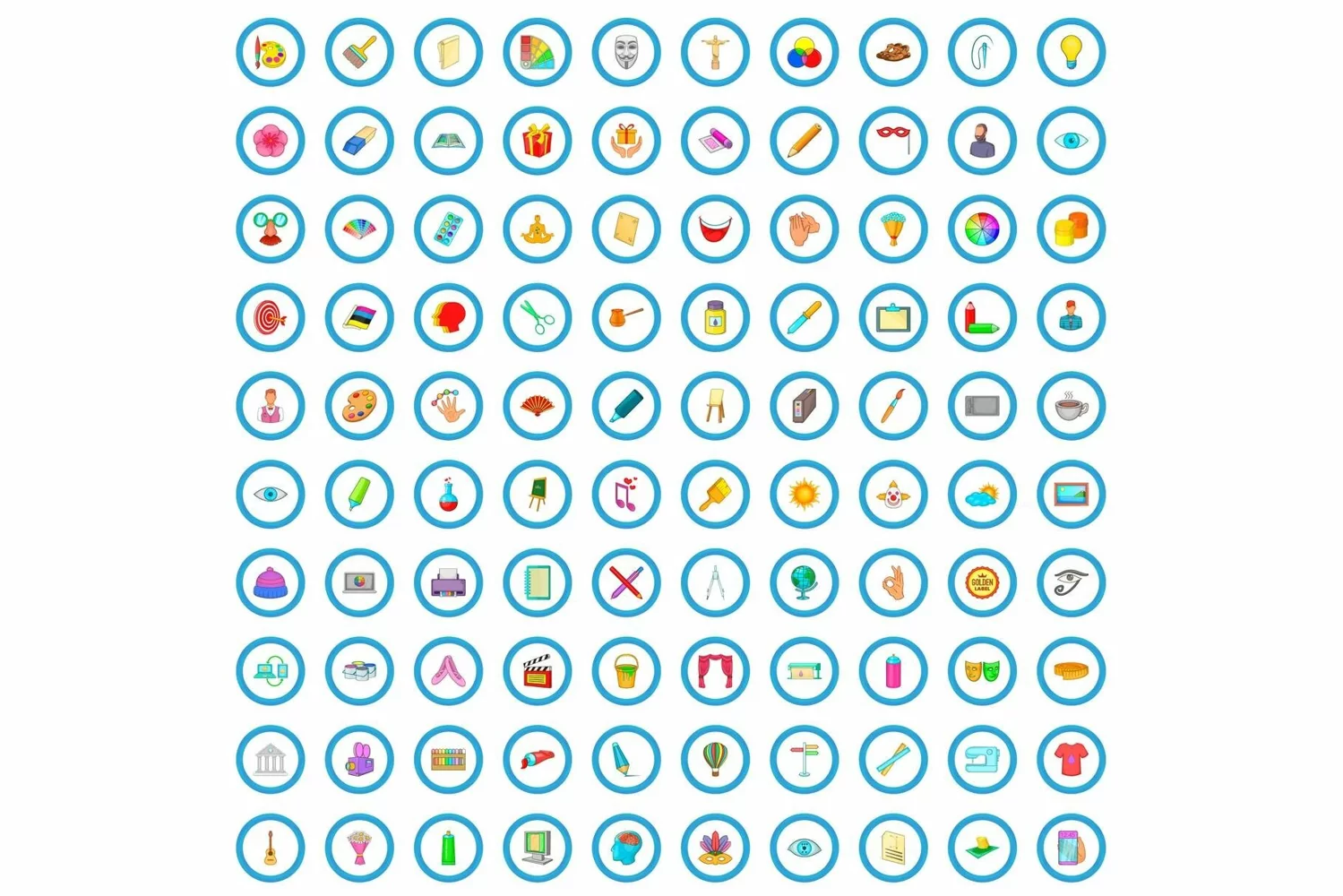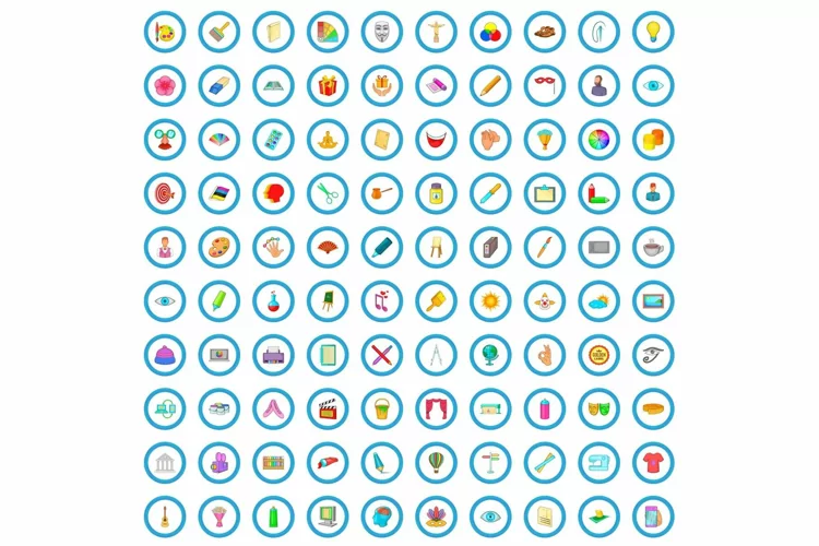100 artwork icons set, cartoon style