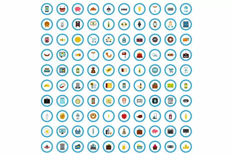 100 purchasing icons set, flat style