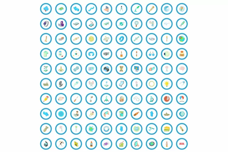 100 science icons set, cartoon style