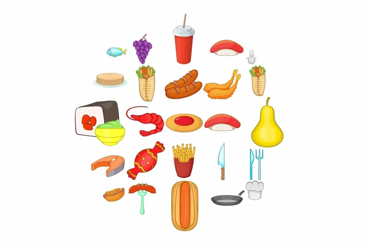 Food court icons set, cartoon style